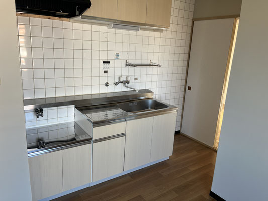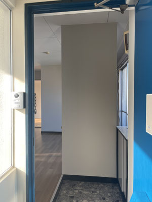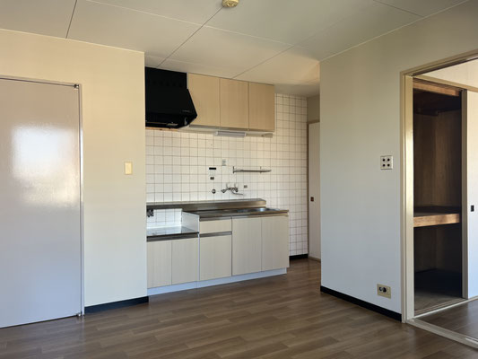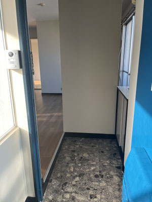 玄関からすぐにダイニングキッチン。良かった。本当に、良かった。午後で。午前じゃなくて、良かった。窓が東を向いておりますから。午前といいますか、朝は結構自然光ふんだんと思います。午後で良かった