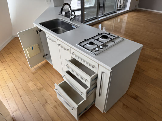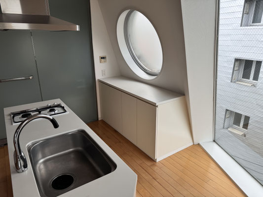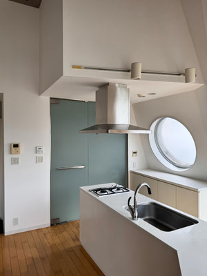 先進的丸窓のスペース、どうします? 2人?3人?、ともかく何人かでお酒片手に立ち話でも。ああ夏 外は暑いからさ、室内がいいよ。2口コンロにたっぷり収納。これじゃあ、なんでも作れちゃうわ