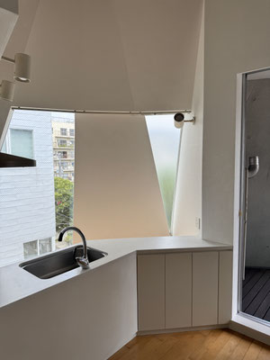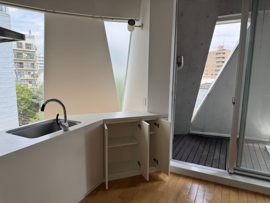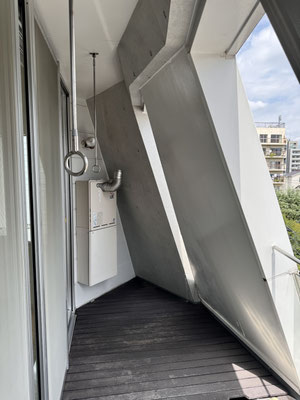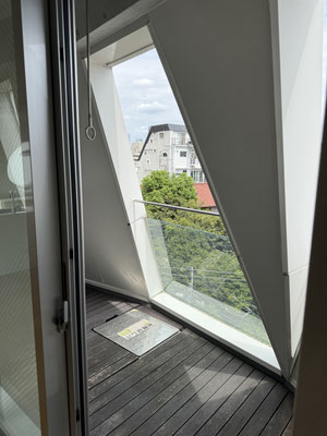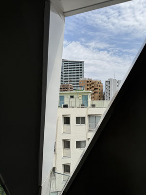 あら。光。差し込んでるね〜。これが先進的ビュー。ここすごく風が抜けるんですよ。気持ちいいな〜 この気持ちよさ、伝われ、伝われ。でもほら、皆さんには内見がありますから、風、一緒に浴びましょうか。