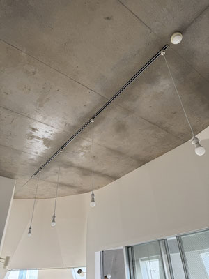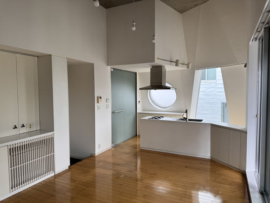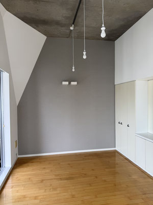 特徴的な柄、内側からも見えてますね。高い高い天井 やっほー かいほうてき〜 約3.8mでした。こりゃ高い。家具も映えそうですね。大きめのダイニングテーブル、いやソファにローテーブルでも、みなさんにお任せしますよ、好きにしなさい。ライティングも抜かりなく。