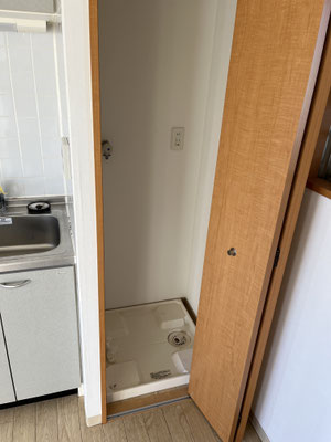 そうなんですよね。ワンルームのお部屋って、どうしても冷蔵庫置き場に困るのですが。このお部屋は、キッチン脇の奥まった箇所に、冷蔵庫置くスペースがあって。壁面には小窓も。そして、ドアを開けると、室内洗濯機置き場。ここに洗濯機置き場がある、ということは、洗面スペースがワチャつかない、ということでもあります。なるほど、なるほど。それと、嬉しいガスコンロ。へへへ