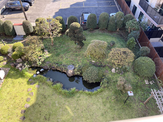 それと、特徴的なのがバルコニー。2箇所ついています。目の前は、駐車場と。見下ろしてみると、池?なるほど、お隣の戸建のお庭みたいですね。しばらくの間は、眺望が良さそうな予感です。周囲に建物はあると言えばありますが。スリットの入ったガラスがついていますので、バルコニーに椅子出して。ひとりリラックスする分には、視線を気にすることなくDOすることができそうです。DOって何?