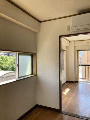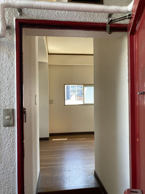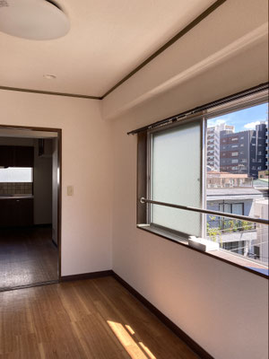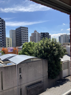 なんだか奥行き感じる1DK. 角部屋ということで、光も入ってくるようで。特に意味はないのですが、お隣敷地の、デザイナーズですね、みたいな建屋のこんもりとした緑にfallin' love