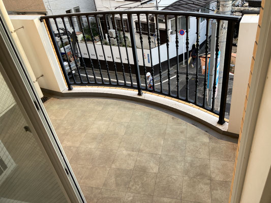 そして、こちらをご覧ください。いえ、警備員のおじさんのことではございません。ちょっと奥行きあるバルコニー。欄干が西洋の風味を感じさせて
