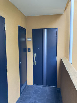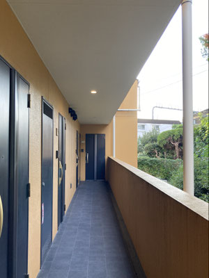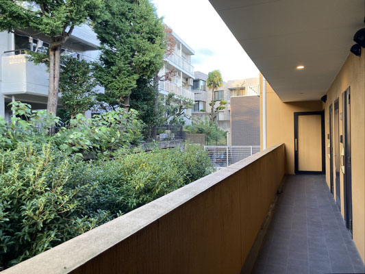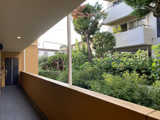 良いですね。外廊下に沿って、お隣の敷地の緑モサモサ。お色味はやはり、山吹色?(合ってます?)この取り合わせ、リゾートホテル感。