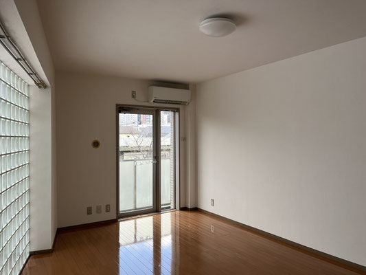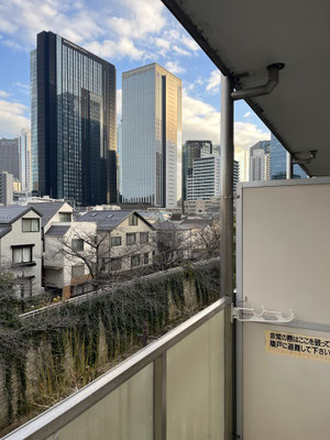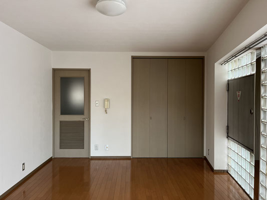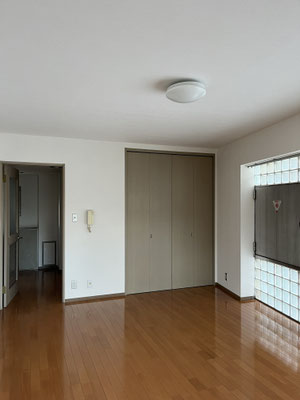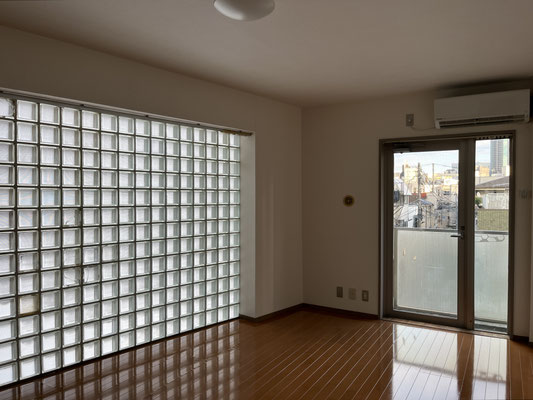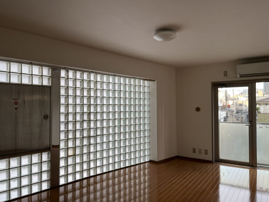 あそこに冷蔵庫置くと、ちょっと通路狭くなるわね、やれやれ、などと思ったのですが。ブロックに次ぐブロック、ガラスブロック。室内は約12帖。へえ。ガラスブロック面は北向きということで。これで西向きだったら、キラキラ過ぎてヤレヤレですが。良かったですね、北向きで。それで、バルコニーへと繋がる窓は東向き。良いじゃないですか