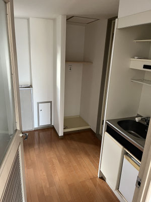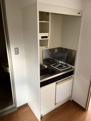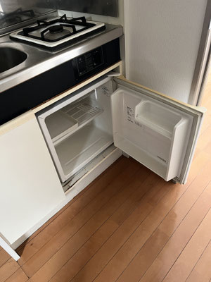いくつか難所ある今回のお部屋。1つ目。キッチン。ミニ冷蔵庫ですか。でもやっぱり、ちょっとした冷蔵庫は置きたい。どこに?ここか。居室に繋がるドアにぶつからないように、壁際に?そうですか