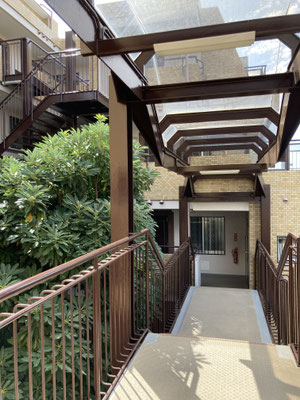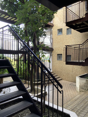 なんですかね。薄いブラウンに、濃いブラウン。緑があって、格子状の窓。コロニアル建築風味を感じるといったら、言い過ぎなんでしょうか。などと思いながらの3階。お部屋、どこ?