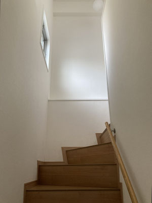 上階へと進む階段。天井の照明は凝りたいですね
