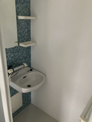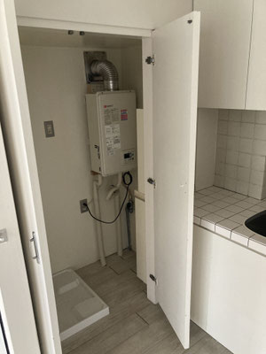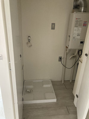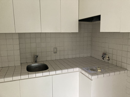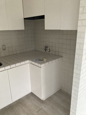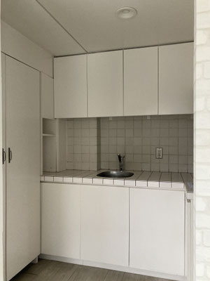 キッチンは白のタイル。シンクはかわいらしいサイズ感だ事。ガスコンロを用意頂き設置する形になります。それと冷蔵庫置き場。キッチン向かって右側の端ですが。上部棚から床下までは145cm~155cmです。