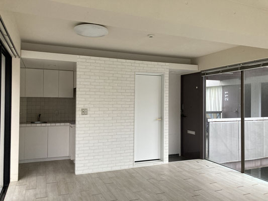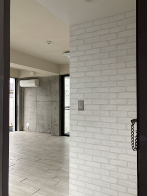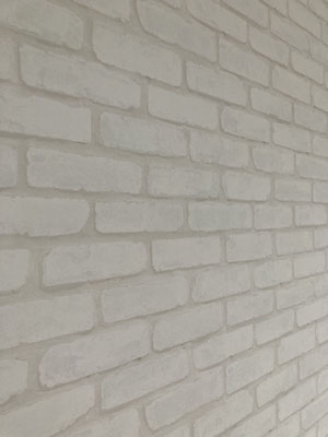 みなさん気になっていた壁紙。この通り、白のレンガ風味の壁紙になっております。これはもう、棚などで隠してしまうのが良いのではないでしょうか