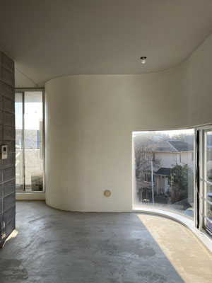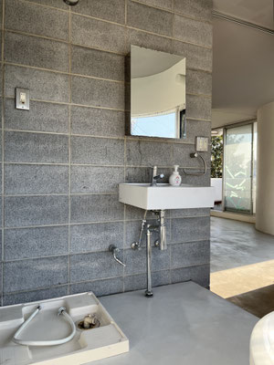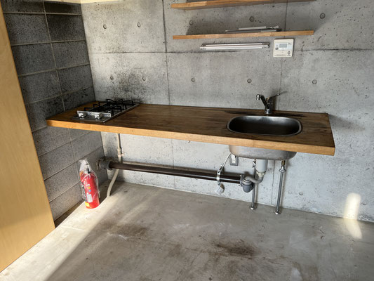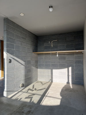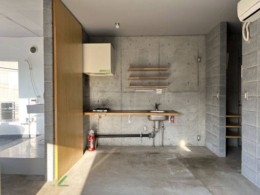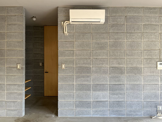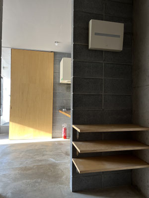 壁面は白塗装、コンクリートブロック、コン打ち。コンクリートブロックは白目地で、ダサくない(?!)。やだ、良いじゃないですか。キッチン脇に冷蔵庫置き場があり、キッチン壁面には棚板が。食器類の収納に工夫が必要かな、と思います。