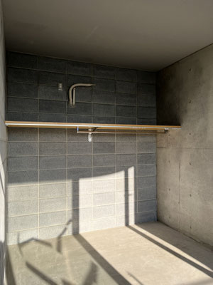 奥の洋室。LDKと奥の洋室とはコンクリートブロックで隔てられています。ただ、仕切り戸はなく、緩やかに繋がっている感覚。壁面には棚板と、ハンガーパイプ。このお部屋、唯一の収納らしい収納スペース。ところで、気になりますよね。キース・ヘリングみたいな影の模様。これはですね。バルコニー に続く窓、これがだいぶヒビが入っていてですね。ヒビを抑えるテープの影なんですよね。きっと、ヒビはこれから修理されるでしょう。(されます)