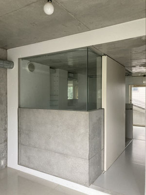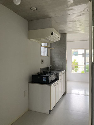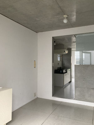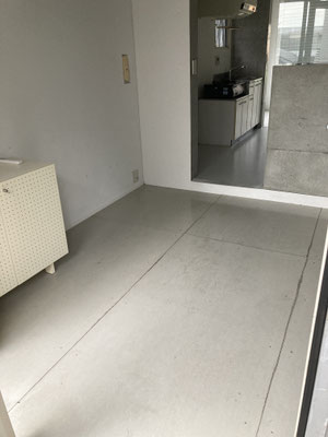 土間?ではないですね。玄関開けて。2Kの間取りの6帖の空間がすぐに。床はコンクリではなくグレートーンのフレキシブルボード