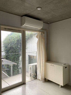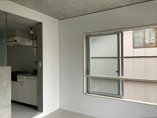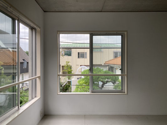 奥の居室は2面に窓。チラリ見える緑に癒されて。どうしても横で撮りたかった私。写真よりも実際の空間は広く感じると思われます(私調べ)
