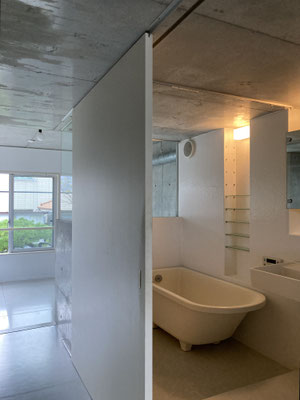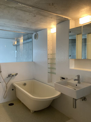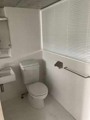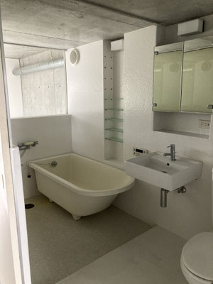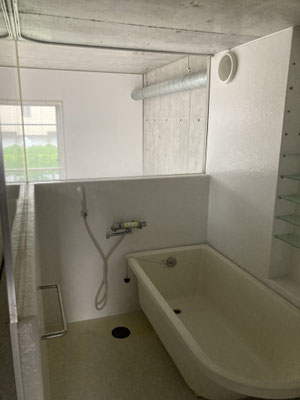 浴槽と洗面、お手洗いが一体となっておりますが。中央の天井にカーテンレールございます。シャワーカーテンなどで仕切って頂くなどを