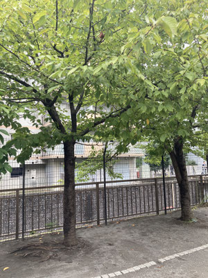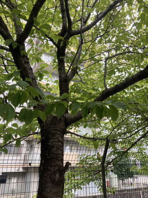 タコと会話してたら、物件に到着しました。木々の向こうから見上げてみました。木々?