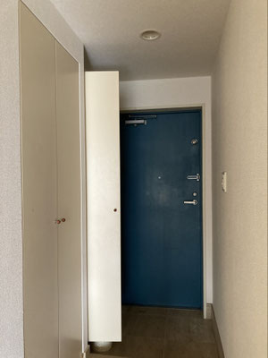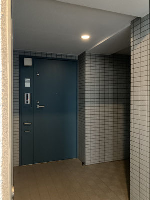 さすが分譲マンションということで。管理人さんもいらっしゃいましたね。それで、4階。角部屋です。玄関は脇の通路の奥になります