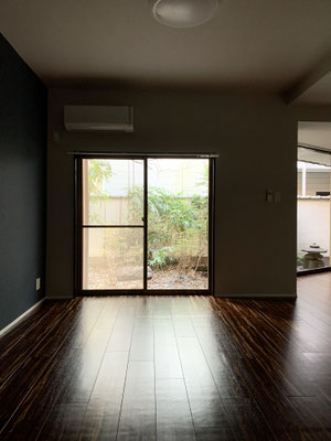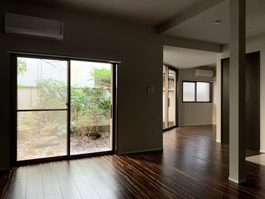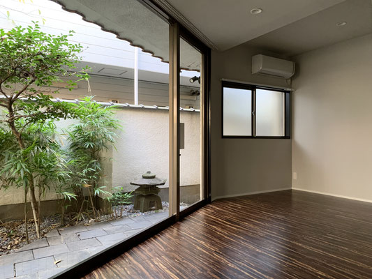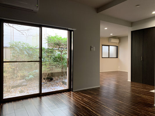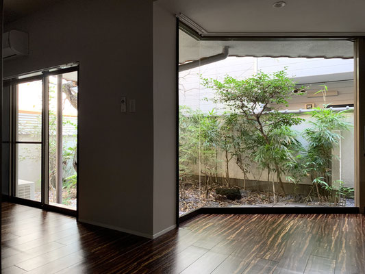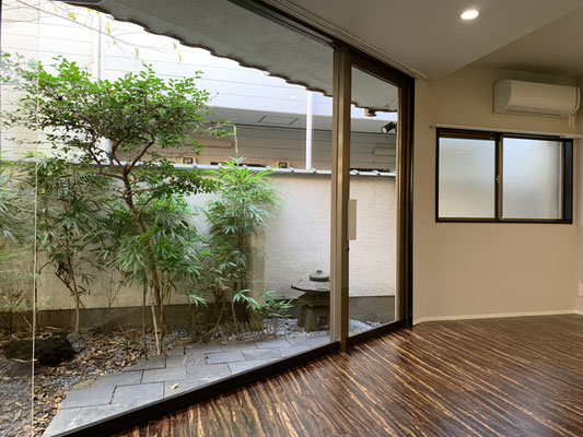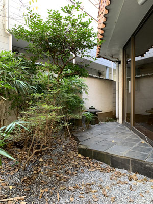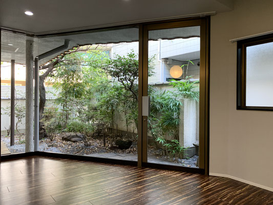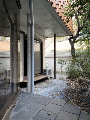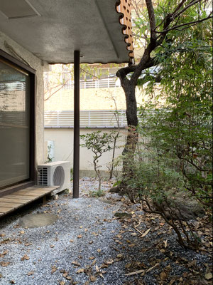 そして問題の庭園。いえ、問題というのはおかしな表現です。素敵な庭園です。砂利敷きの庭に植樹。庭園風のオブジェも配された小粋な空間。突き出した屋根の下には石造りの床に、リビング側の窓にはちょっとした縁側が。植樹の葉が色付くのであれば、なかなか情感ある空間なのかも知れません。周囲は住居に囲まれていて、完全プライベートな空間というわけにはいきません。ただ塀はありますし、縁側でのんびりするのであれば、それほど気にもならないかも知れません。そういえば、この空間、小雨降る日なんかも良いかも知れません。しとしとと降る雨を葉が弾く音を聴くだなんて、案外乙な過ごし方かも知れません。
