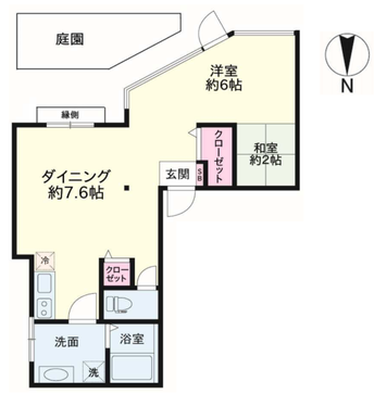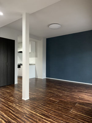 間取りは1DKですが、リビングダイニングと洋室に仕切りのない変則的なスタイル。1976年に建築された建物をこの11月にリノベーションを施して生まれ変わった内観。室内中央に柱が1本、東側の壁面にはアクセントクロスが。特徴的なのは、南側に設えられた庭園を眺めることの出来る広々とした窓。開口部は大きく、室内から庭園を眺めるだけでものんびりできそうです。