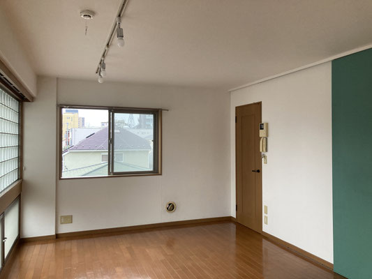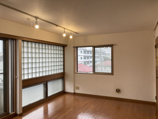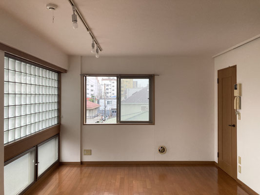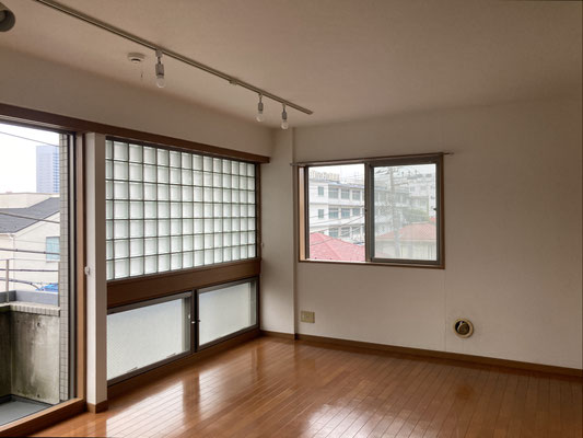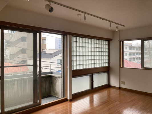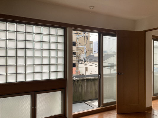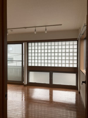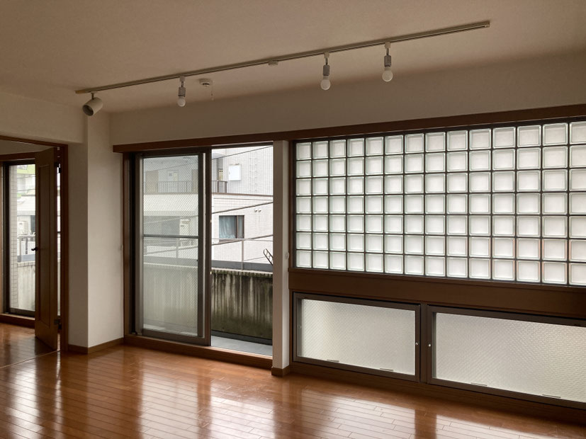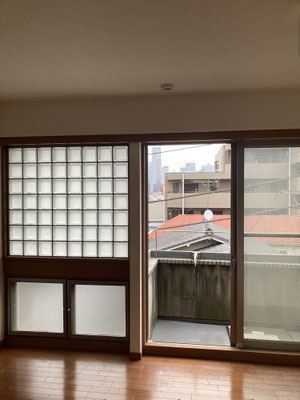 たぶん伝わらないと思うのですが。ここでパソコンの電源が切れました。プツッ OFF 伝わらないですか。それで、奥の居室にも、大層なガラスブロックたちが。窓の外、ビルが見えますね。新宿の、ビル?